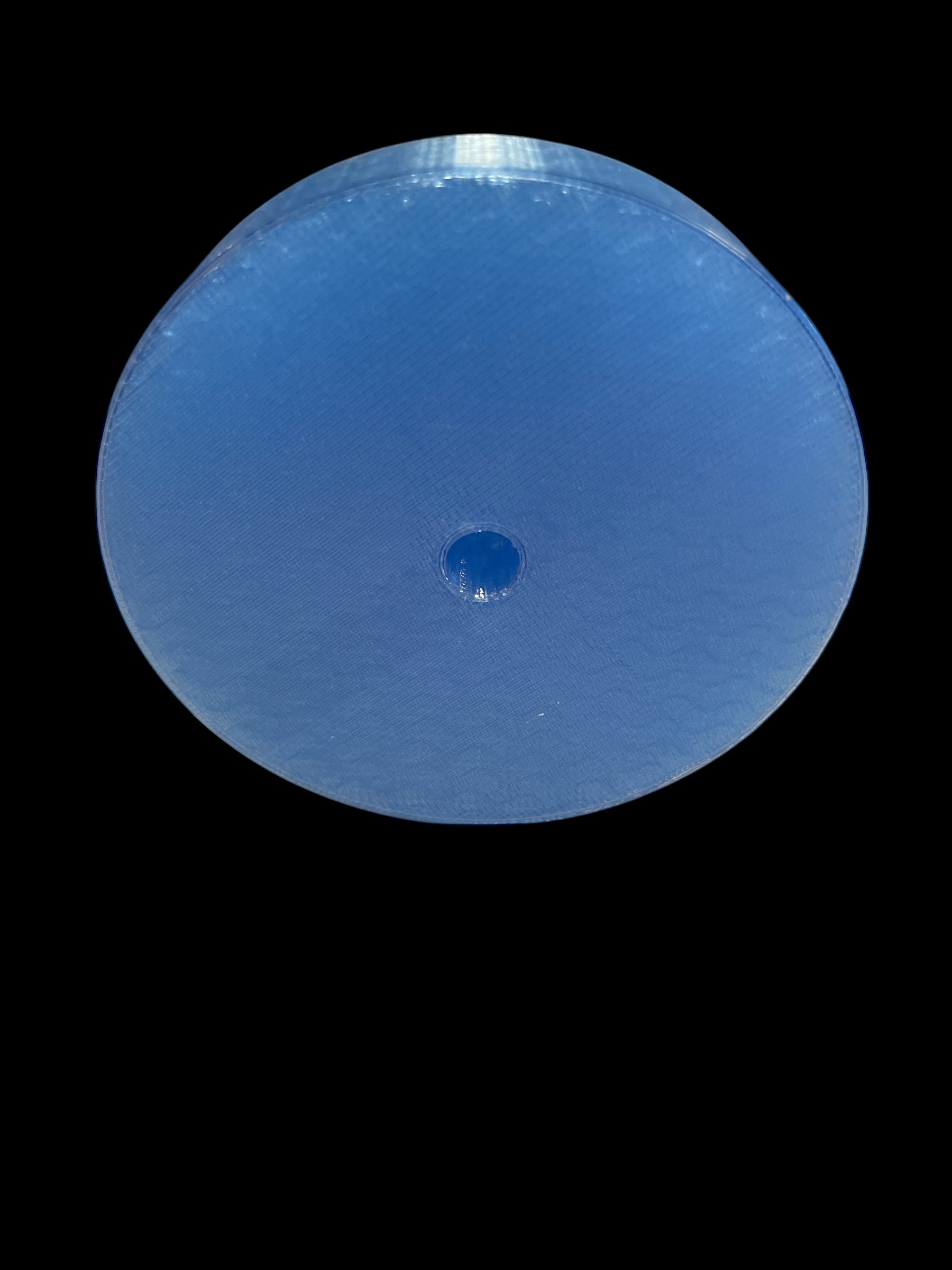 Our pond measures 3” wide by .7” tall and has a hole in the bottom center for your turntable peg
