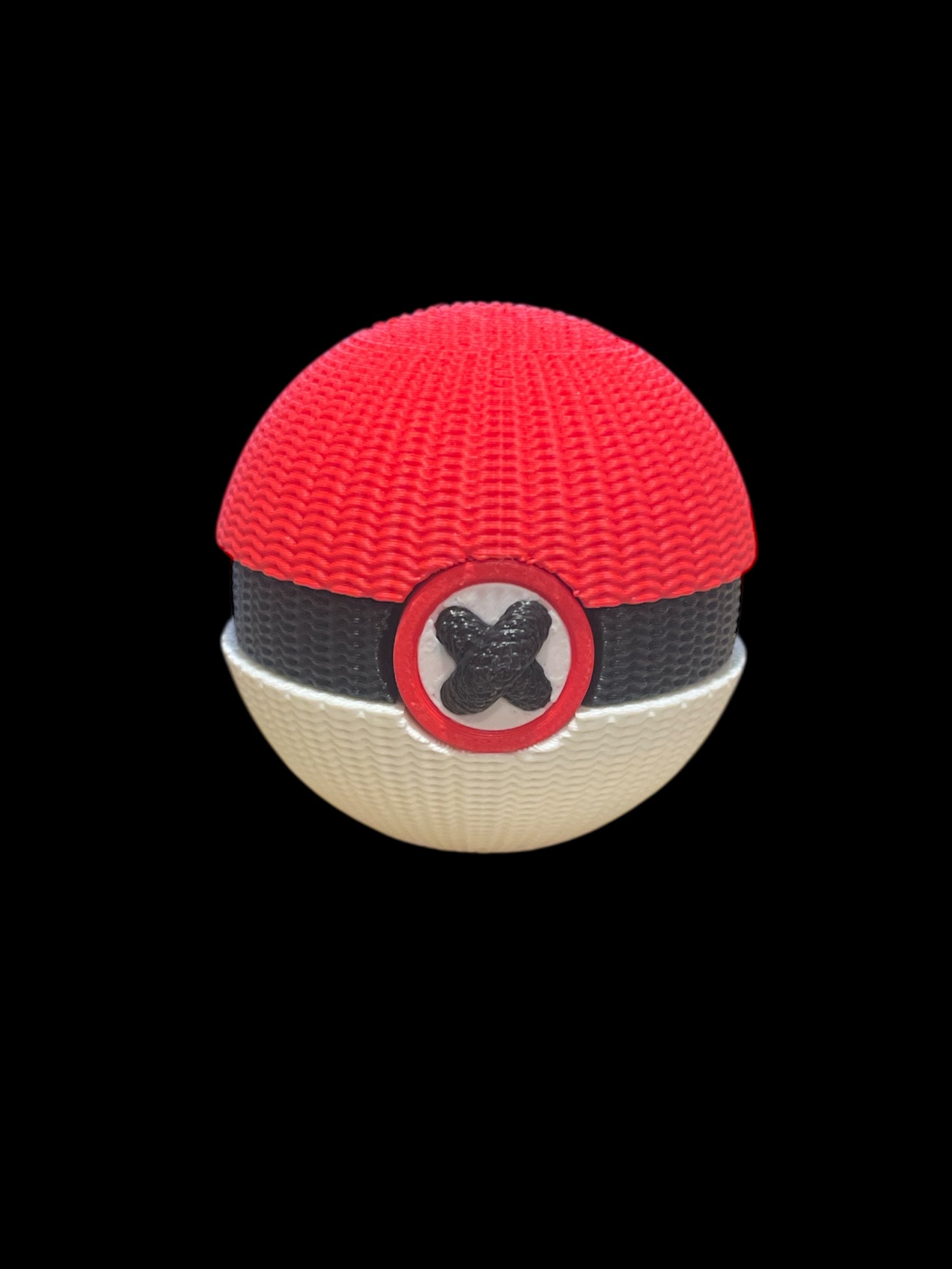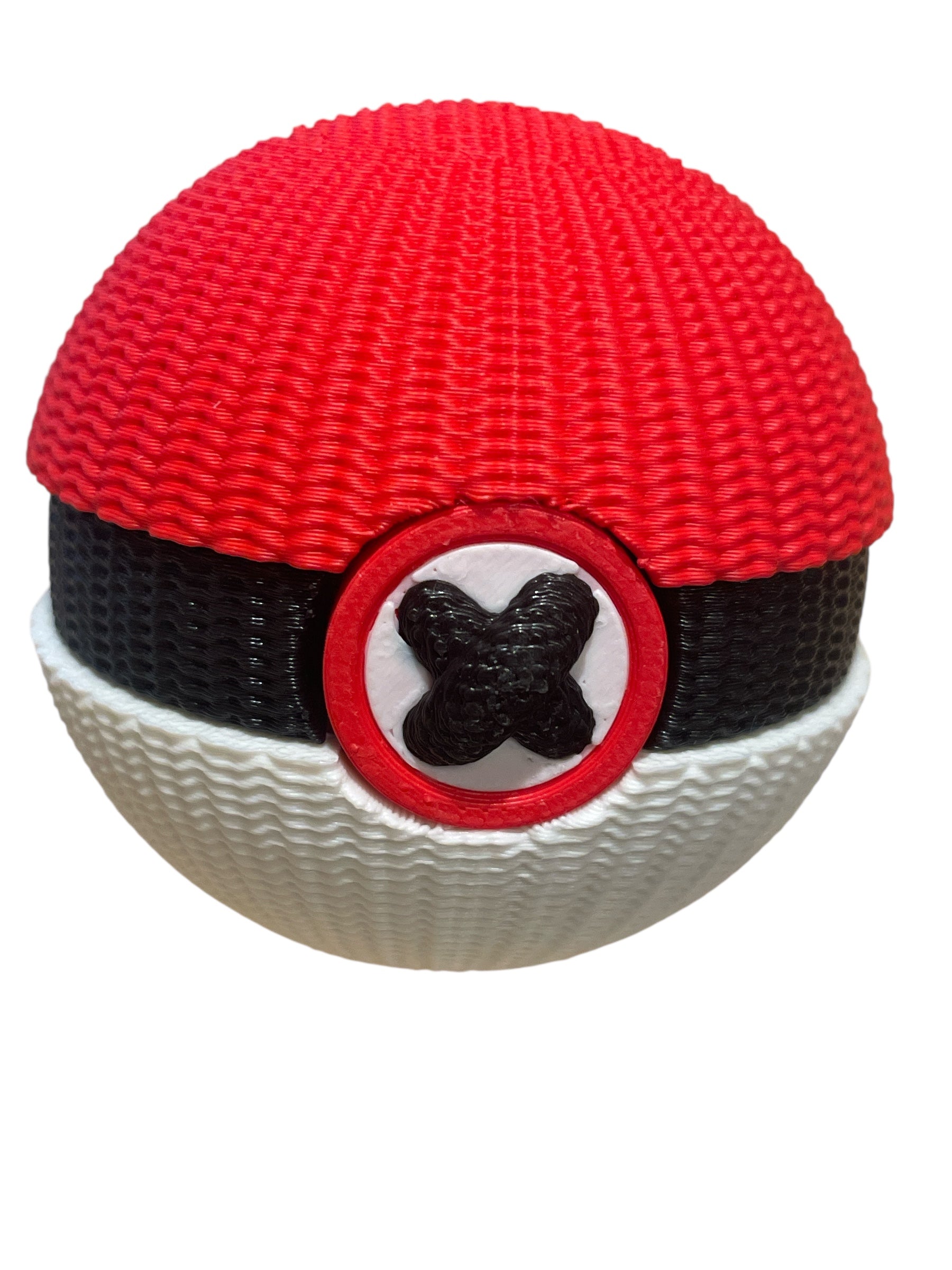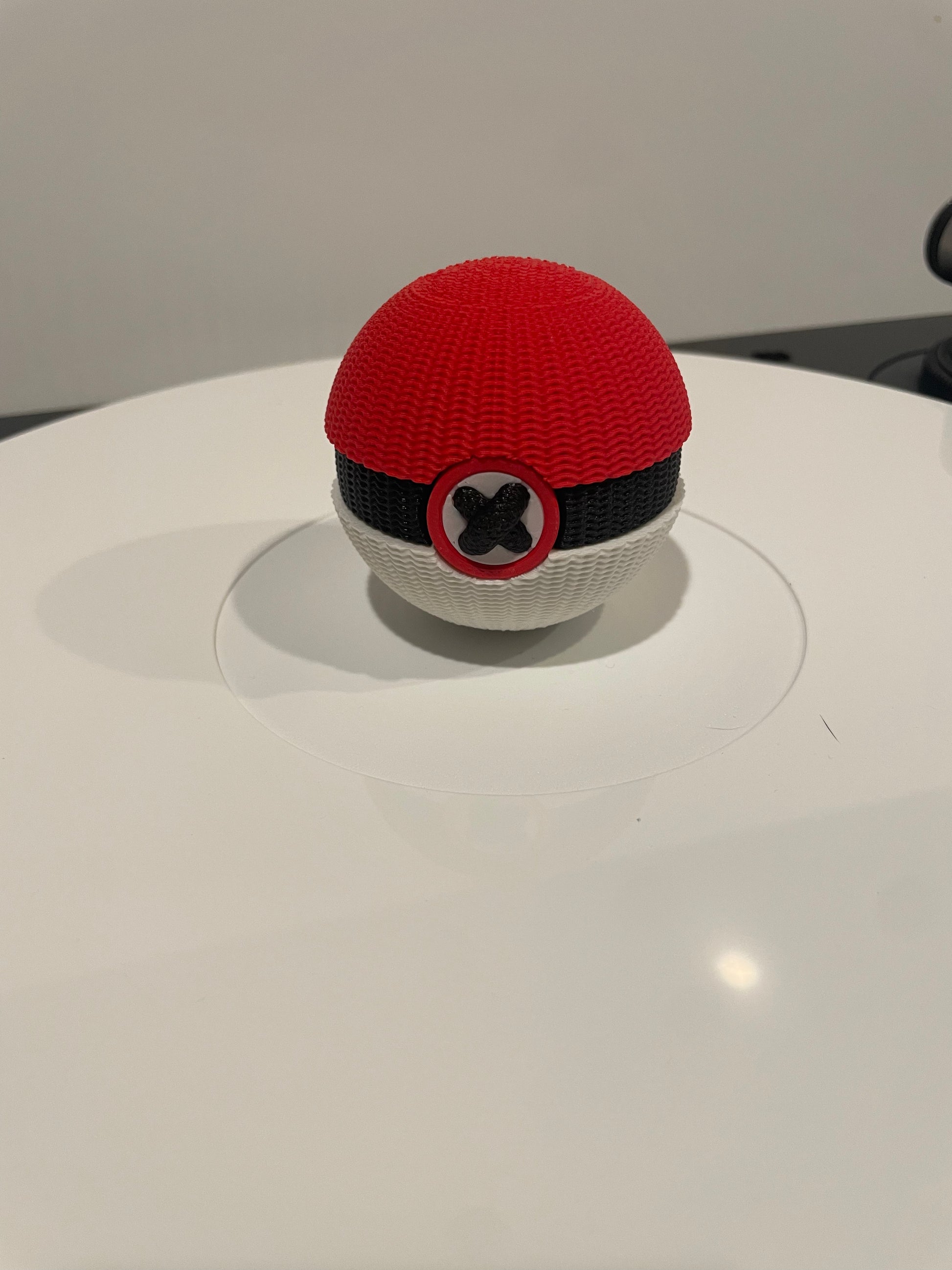 Our new poke ball has a quilted design and a 'button' on the front. It has a hole in the bottom for spinning on your turntable peg but also stands on it's own as a decoration.