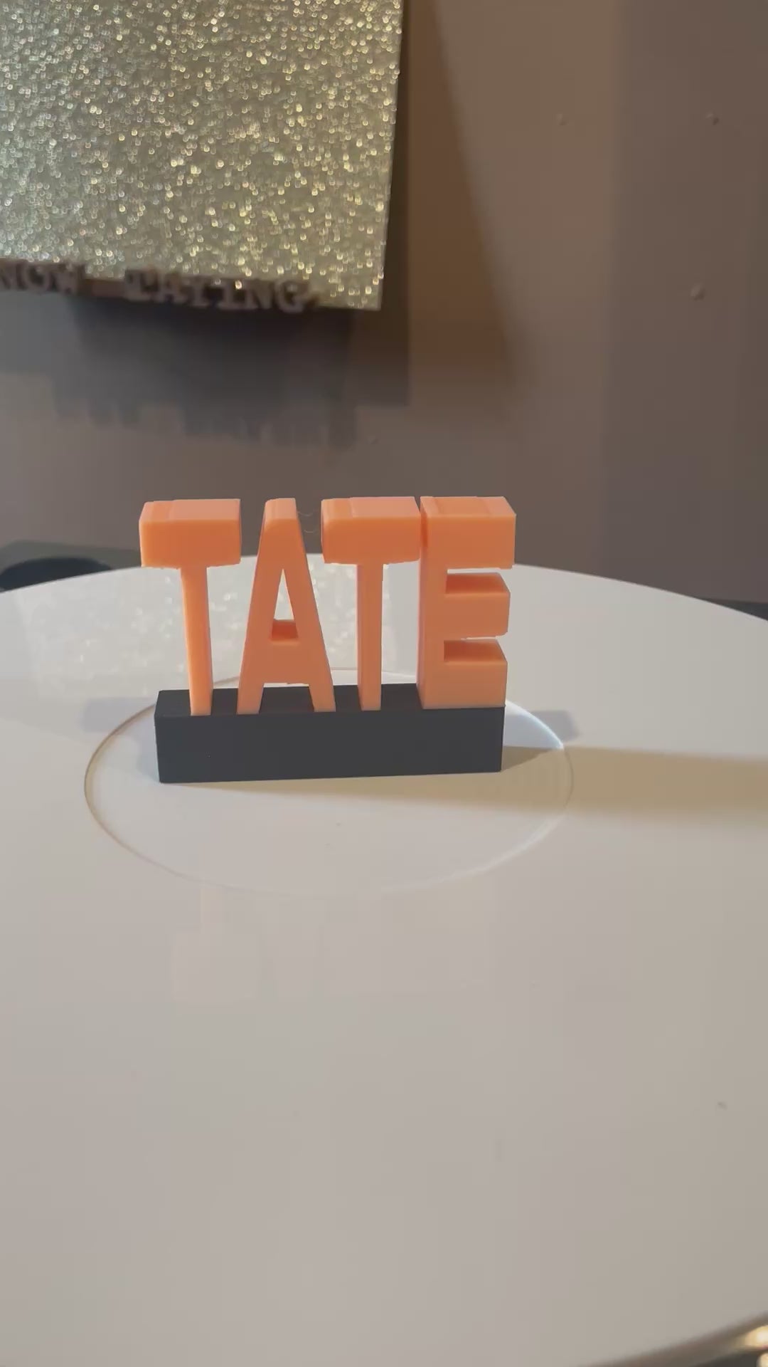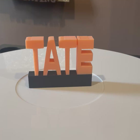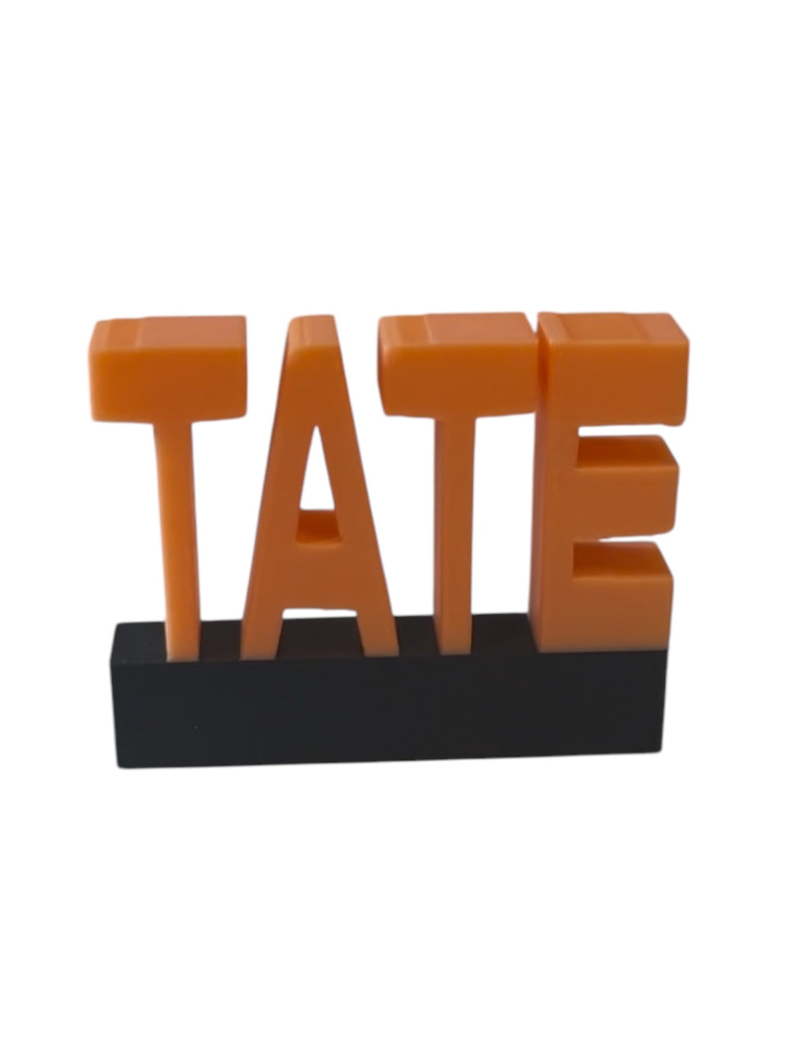 TATE measures 2.95" wide x 2.3" tall x 0.55" deep. Default color is glow in dark light orange letters and black base.