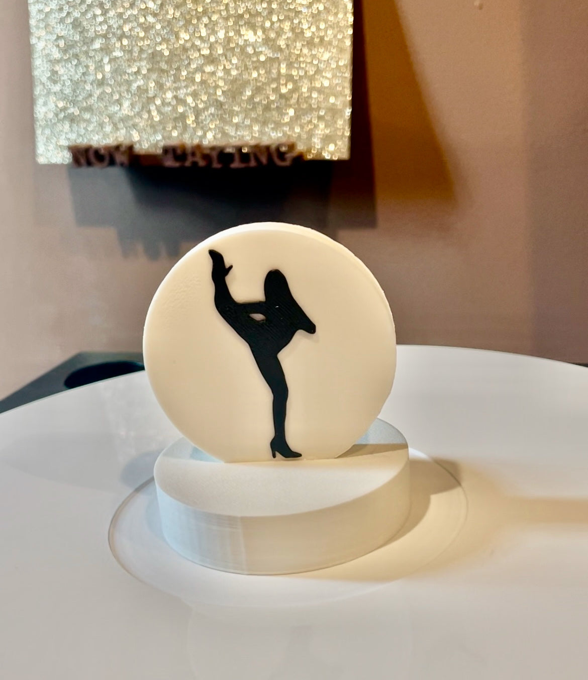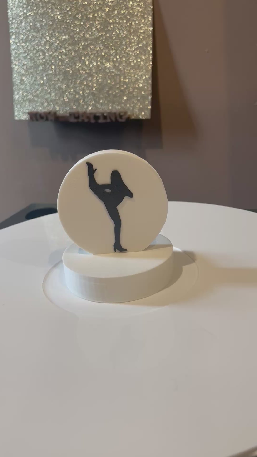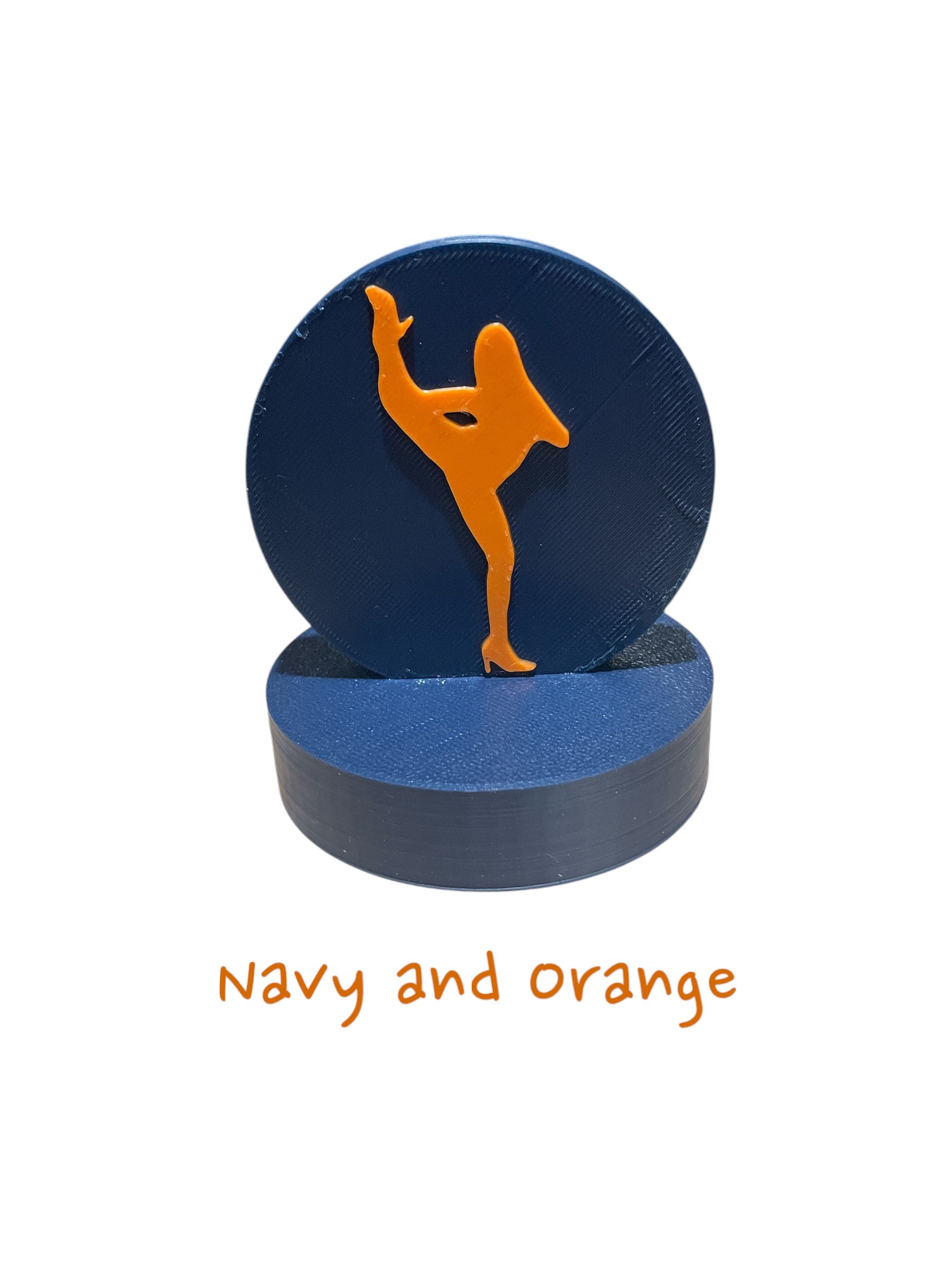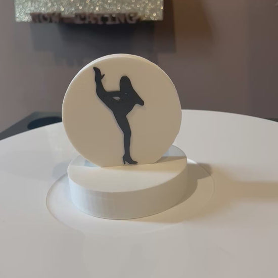 Silhouette charm is on a circle base 2.95" around. Height is 3.33". Default color is as shown--white with black silhouette.